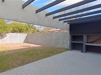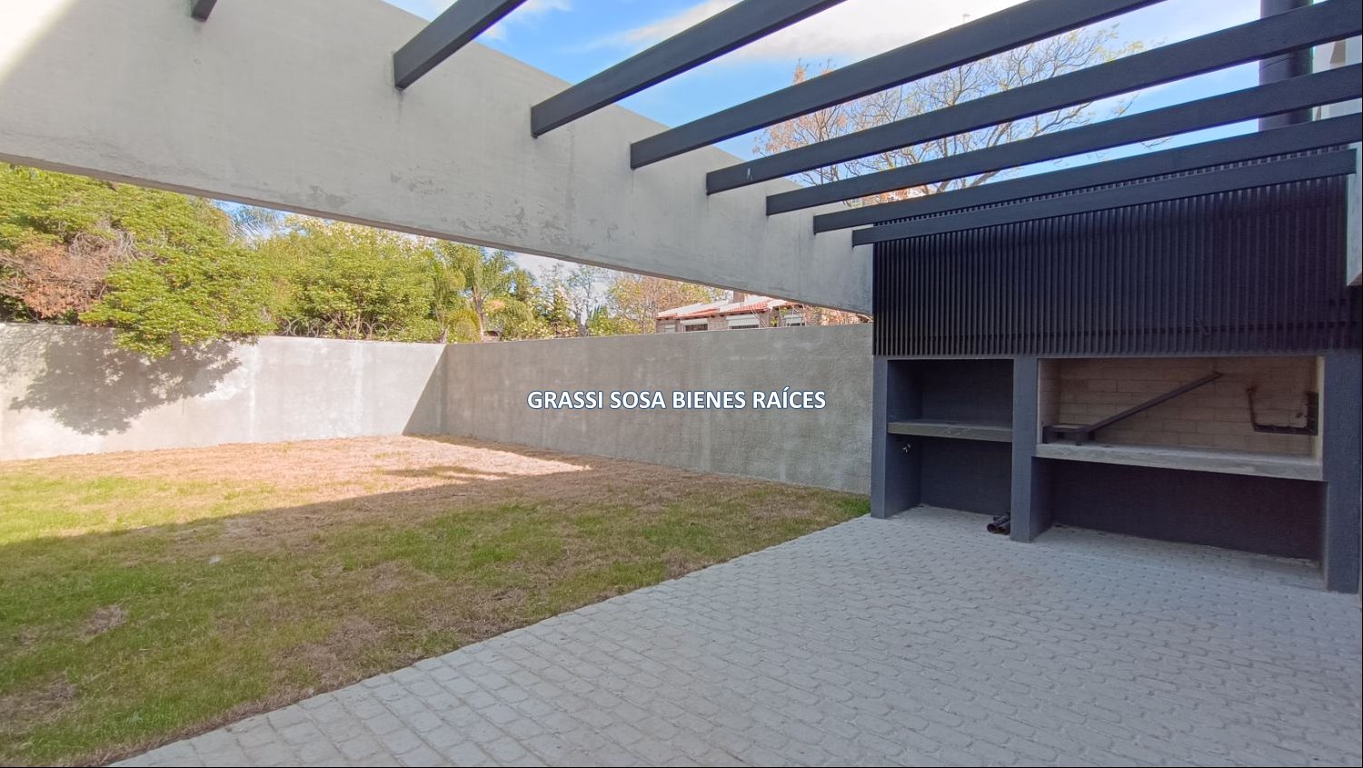 Hermoso fondo con parrillero y área de living exterior con pergolado.